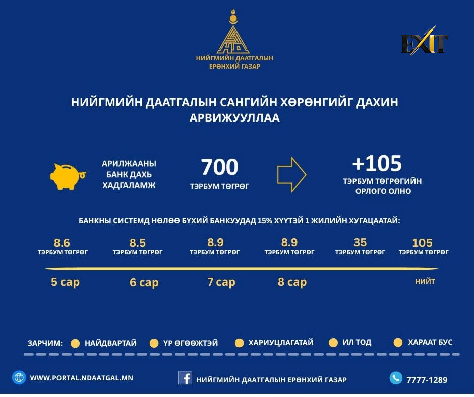 Банкуудтай байгуулсан гэрээний дагуу 2025 оны 8 дугаар сарын хүү болох 8.9 тэрбум төгрөгийн орлогыг санд хүлээн авч,нийгмийн даатгалын сангийн хөрөнгийг дахин арвижууллаа. Өмнө нь 5,6,7 дугаар сарын хүү болох 26.1 тэрбум төгрөгийг хүлээн авсан ба одоогийн байдлаар нийт 35 тэрбум төгрөгийн хүүгийн орлого хүлээн аваад байна.