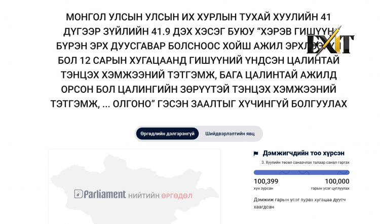 Монгол Улсын Үндсэн хуулийн 23 дугаар зүйлийн 2 дах хэсэг, Улсын Их Хурлын тухай хуулийн 7 дугаар зүйлийн 7.3, 7.4 дах хэсэгт улсын их хурлын гишүүний бүрэн эрхийн хугацаа 4 жил, бүрэн эрх нь төрийн сүлдэнд тангараг өргөснөөр эхэлж, Улсын Их Хурлын дараагийн сонгуулиар шинэ сонгогдсон гишүүд тангараг өргөснөөр дуусгавар болохоор хуульчлагдсан. Өөрөөр хэлбэл дээрх бүрэн эрхийн хугацаа, бүрэн эрх нь дуусгавар болоход улсын их хурлын гишүүн нь Монгол Улсын жирийн иргэн гэх статустай болно. Гэтэл Улсын Их Хурлын тухай хуулийн 41 дүгээр зүйлийн 41.9 дэх хэсэгт “Хэрэв гишүүн бүрэн эрх дуусгавар болсноос хойш ажил эрхлээгүй бол 12 сарын хугацаанд гишүүний үндсэн цалинтай тэнцэх хэмжээний тэтгэмж, бага цалинтай ажилд орсон бол цалингийн зөрүүтэй тэнцэх хэмжээний тэтгэмж, гишүүнээр сонгогдохоосоо өмнө оршин сууж байсан газартаа шилжвэл өөрийнх нь болон гэр бүлийн гишүүний замын зардал, ачаа, тээшний хөлсийг авто тээврийн тарифаар тооцож олгоно” гэсэн нь тодорхой хэсэг, бүлэг этгээдүүдэд давуу байдал бий болгосон, цөөнхийн эрх ашигт нийцсэн, адил хүчин чадалтай хуулийн холбогдох заалтыг зөрчсөн, Монгол Улсын нийт иргэн болон улсын ашиг сонирхолд хохиролтой, Монгол Улсын Үндсэн хуулийн 14 дугаар зүйлийн 1 дэх хэсэгт заасан “Монгол Улсад хууль ёсоор оршин суугаа хүн бүр хууль, шүүхийн өмнө эрх тэгш байна” гэж, 2 дахь хэсэгт заасан “Хүнийг үндэс, угсаа, хэл, арьсны өнгө, нас, хүйс, нийгмийн гарал, байдал, хөрөнгө чинээ, эрхэлсэн ажил, албан тушаал, шашин шүтлэг, үзэл бодол, боловсролоор нь ялгаварлан гадуурхаж үл болно. Хүн бүр эрх зүйн этгээд байна” гэсэн заалтудыг зөрчсөн байна. Хууль тогтоогч өөртөө хуулийн аргаар илт давуу байдал бий болгосон нь Монгол Улсын Үндсэн хуулийн өмнөтгөл хэсгийн Монголын ард түмэн бид: “...хүний эрх, эрх чөлөө, шударга ёс, үндэснийхээ эв нэгдлийг эрхэмлэн дээдэлж, ...эх орондоо хүмүүнлэг, иргэний ардчилсан нийгэм цогцлуулан хөгжүүлэхийг эрхэм зорилго болгоно” гэсэн тунхаглалтай шууд зөрчилдөж байна" гэсэн юм. Санал хураах хугацаа энэ сарын 28-нд дуусах бөгөөд иргэдийн санал 100 мянгад хүрснээр Өргөдлийн байнгын хороогоор энэ саналыг авч хэлэлцэх, дэмжигдвэл энэ асуудлаар хууль санаачлах эрх нээгдэх юм.
