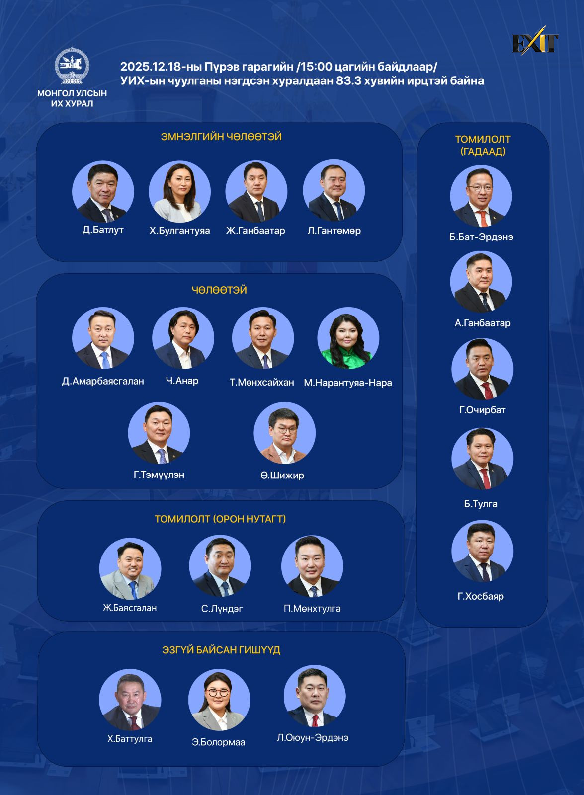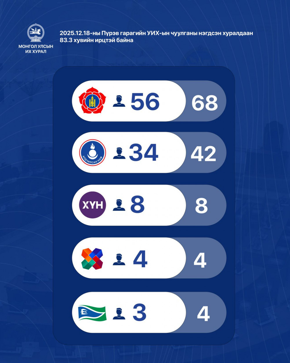 Өнөөдөр буюу 2025 оны 12 сарын 18-ны өдрийн УИХ-ын нэгдсэн чуулганы ирц 83,3 хувьтай байна.