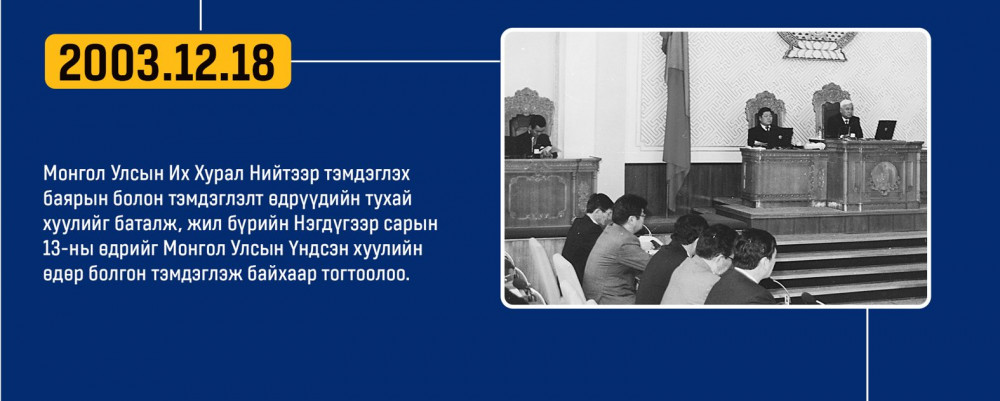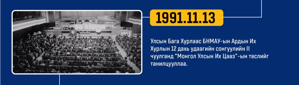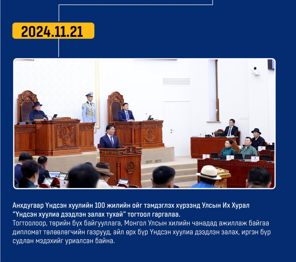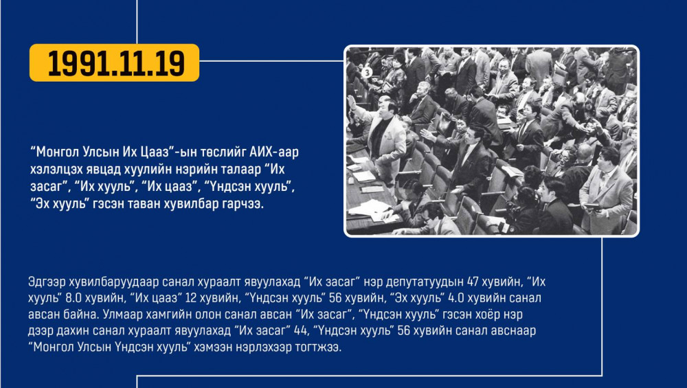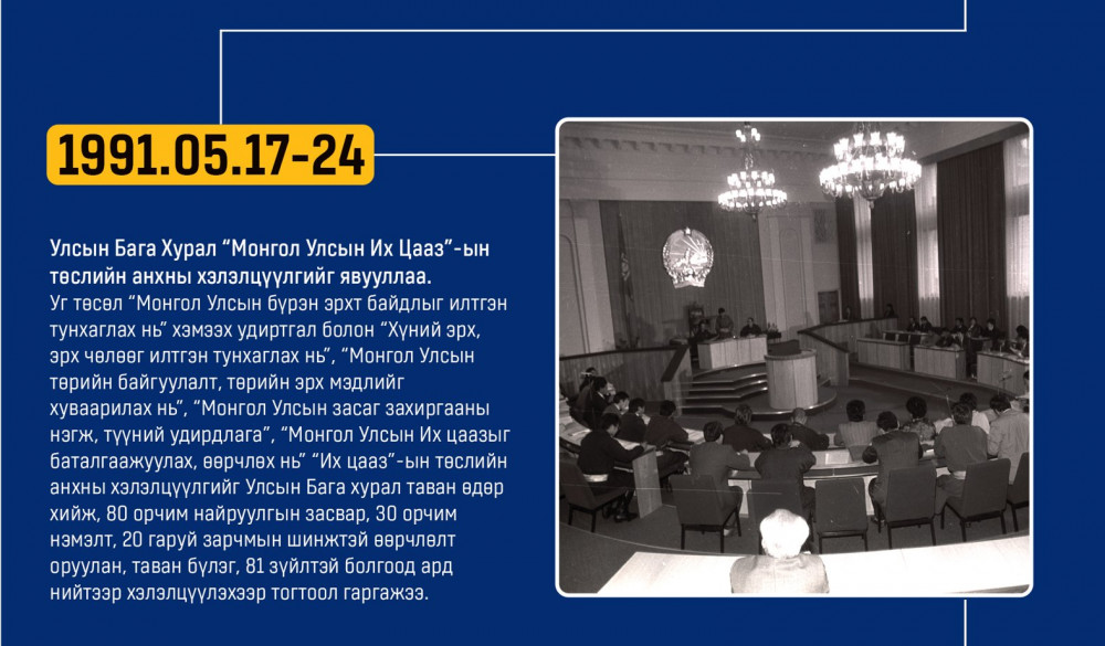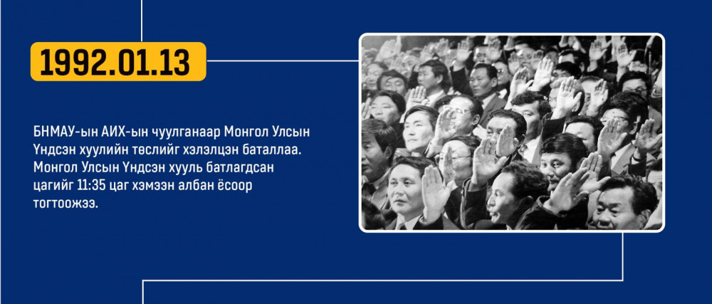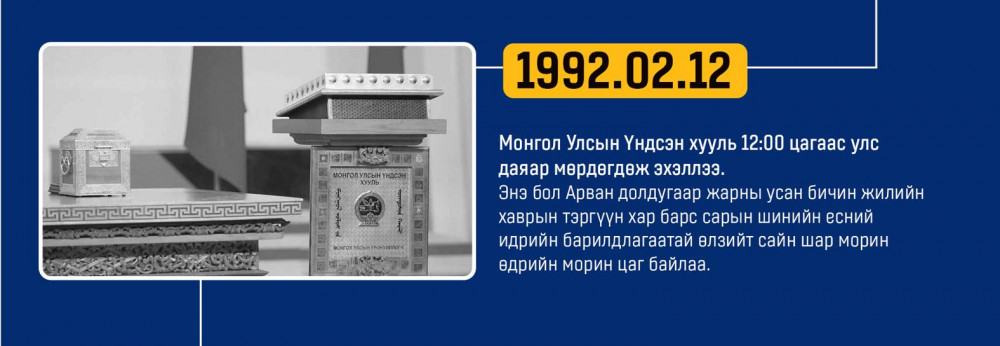 Монгол улсын Ардчилсан Үндсэн хууль энэ онд 34 жилийнхээ ойтой золгож байгаа билээ. Тэгвэл хууль батлах дээд байгууллага болох УИХ-аас Монгол Улсын Үндсэн хуулийн өдрийг угтан Монголын ард түмний оюун санааны хамтын бүтээл, язгуур эрх ашиг, туйлын хүслэнгийн илэрхийлэл болсон ардчилсан Үндсэн хуульд холбогдох гол чухал өдрүүд, үйл явдлуудыг цаг хугацааны дараалалд хэлхэн толилуулсныг та бүхэндээ хүргэж байна.