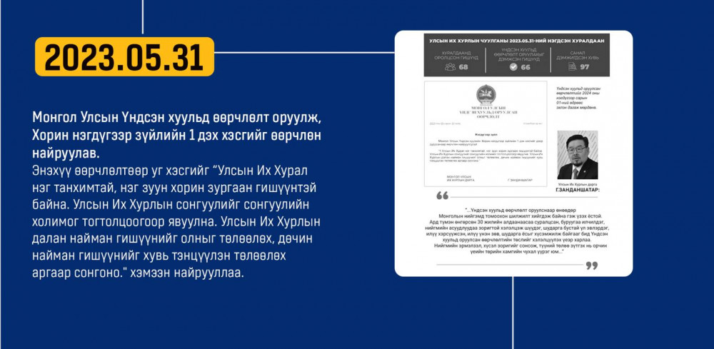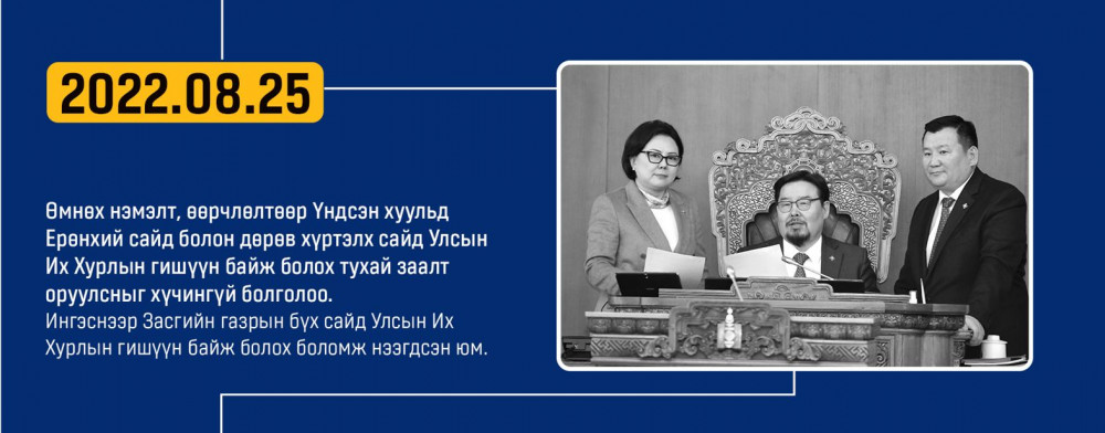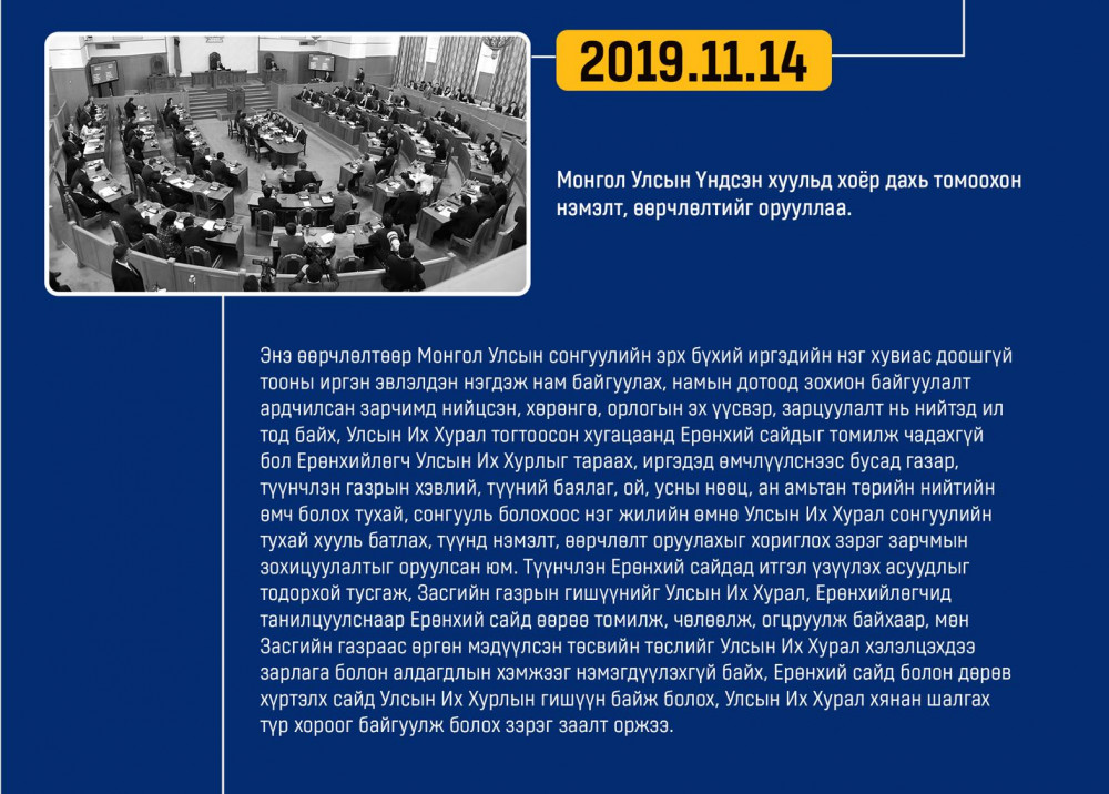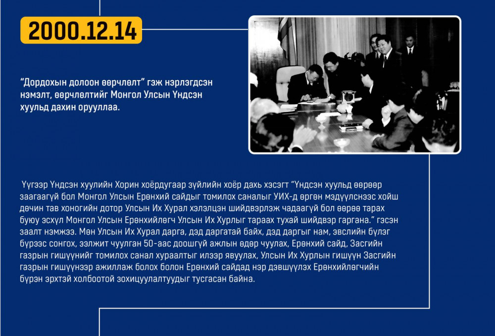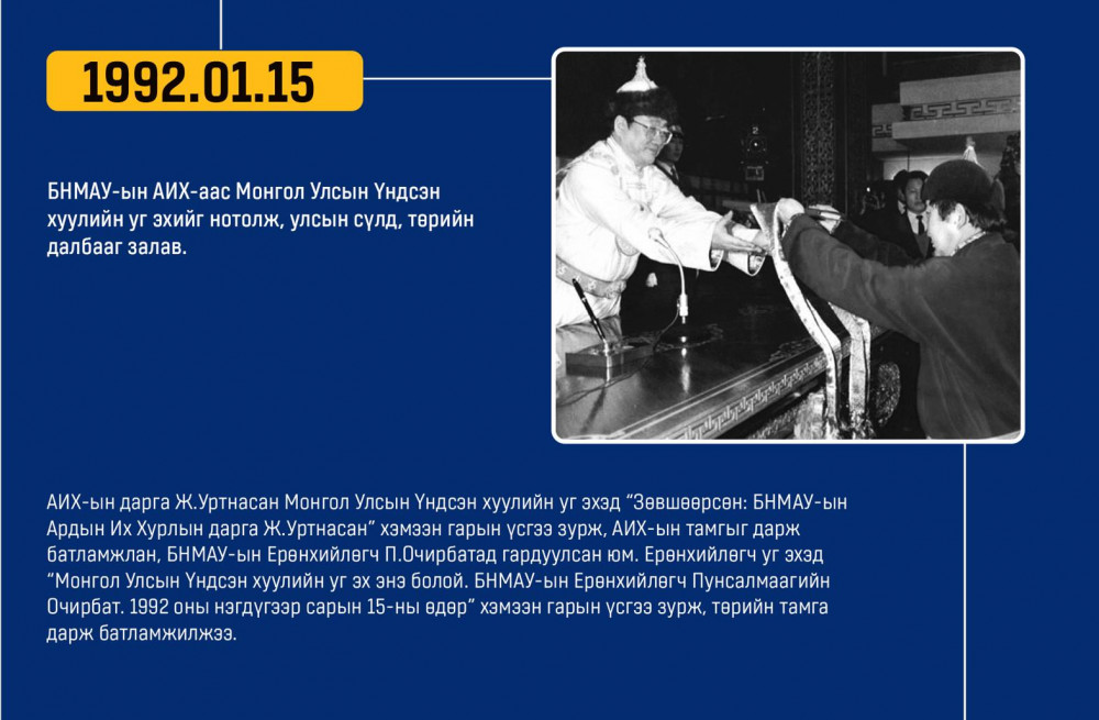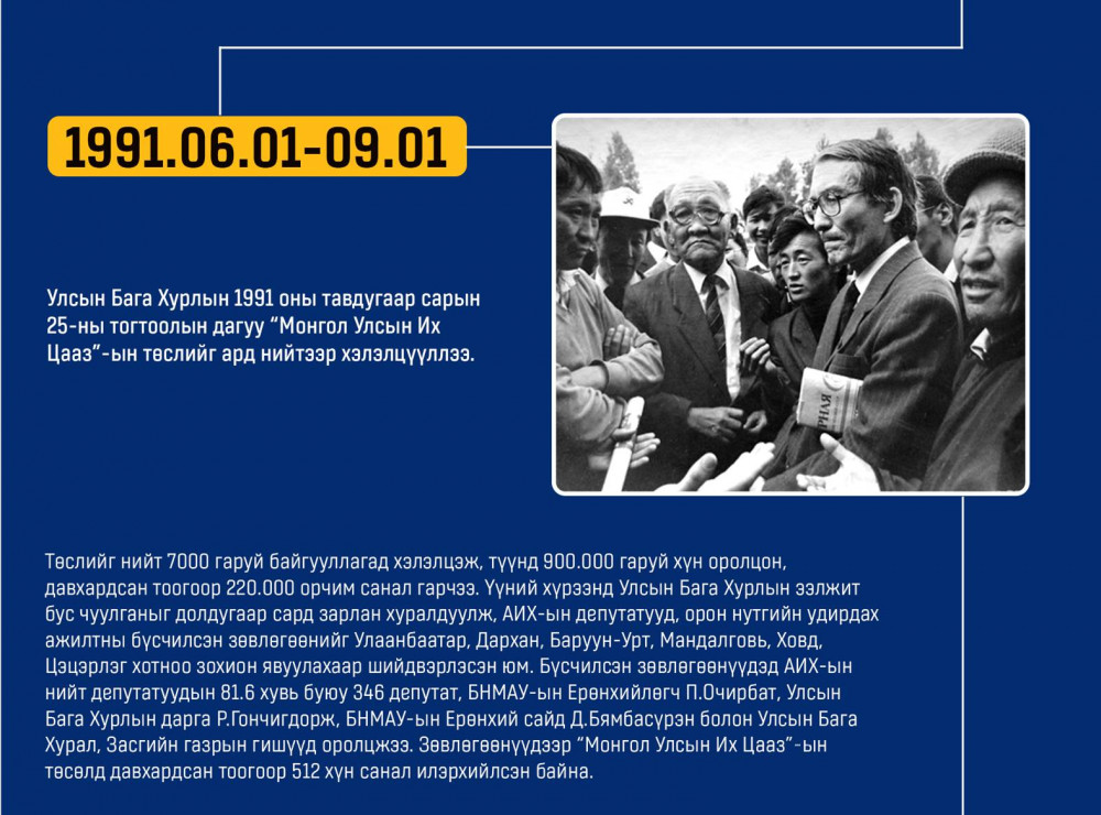 Монгол улсын Ардчилсан Үндсэн хууль энэ онд 34 жилийнхээ ойтой золгож байгаа билээ. Тэгвэл хууль батлах дээд байгууллага болох УИХ-аас Монгол Улсын Үндсэн хуулийн өдрийг угтан Монголын ард түмний оюун санааны хамтын бүтээл, язгуур эрх ашиг, туйлын хүслэнгийн илэрхийлэл болсон ардчилсан Үндсэн хуульд холбогдох гол чухал өдрүүд, үйл явдлуудыг цаг хугацааны дараалалд хэлхэн толилуулсныг та бүхэндээ хүргэж байна.