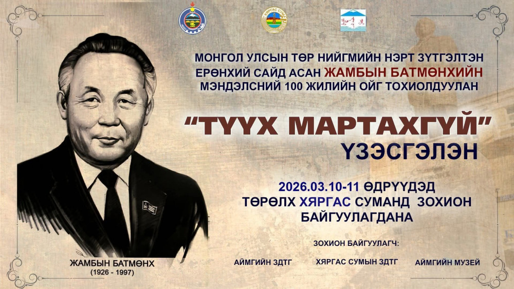 Мөн түүний мэндэлсний 100 жилийн ойн хүрээнд “ТҮҮХ МАРТАХГҮЙ” үзэсгэлэн 2026.03.10-11 өдрүүдэд төлөрх суманд нь буюу Увс аймгийн Хяргас суманд зохион байгуулагдах юм байна. Үзэсгэлэнгээр дамжуулан Жамбын Батмөнхийн амьдралын түүхийг хүүхэд багачууд болон ард иргэдэд сурталчлан таниулах, алдаршуулах, бахархах, эх оронч үзлийг төлөвшүүлэх зорилготой юм.